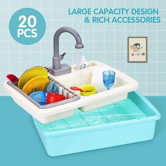 Running Water Technology: Experience the thrill of a realistic kitchen environment with our cutting-edge running water feature. Simply turn the faucet, and watch as water flows just like in a real sink – perfect for those pretend dishwashing moments!